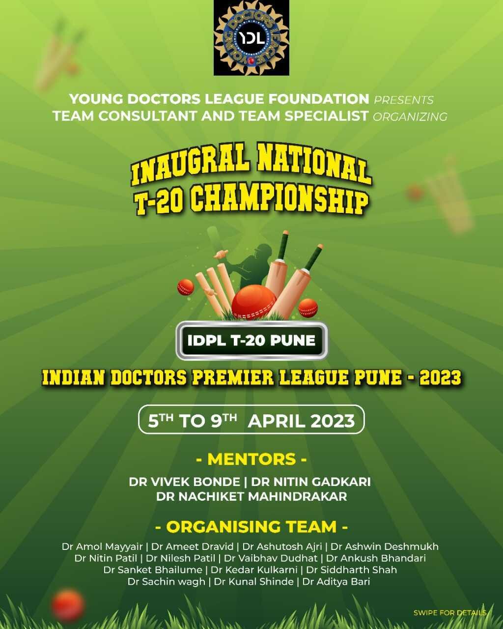 HEIGHLIGHTS: 1. T-20 leather ball matches with all international rules 2. All registered doctors MBBS, BAMS, BHMS, BUMS are allowed (No UGs, interns or allied pathies) 3. Squad of 15 Members to be sent including registration numbers 4. Registration Fees- Rs.65000 Only 5. Only 16 teams can participate 6. Four groups- Each team plays 3 league matches 7. Knockout includes Quarterfinals 8. All matches will be played on 4 National level Cricket Grounds (Neharu Stadium, Poona Club) 9. Registration includes Jerseys, breakfast and lunch (Excluding stay) 10. Exciting cash prices and trophies for winners and Runner up